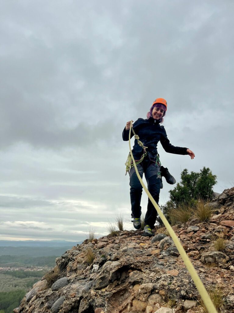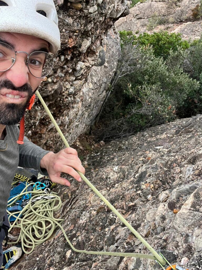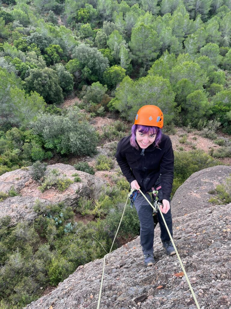 Allà va començar a ploure una mica, però vam tirar endavant. El petit drama va ser a la primera reunió al collet, on em va agafar un atac de cagalera que vaig haver de deixar la pobra Aina penjant i baixar per una canal cap a l’Oest per poder cagar. Per acabar, l’últim llarg estava bastant moll, menys mal que era de canto i no de finura. 10/10 repetiria. Bona roca.